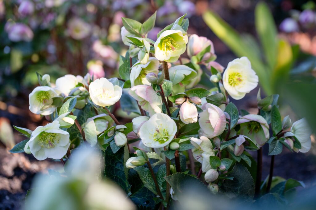 Hellebores prefer part to full shade, and will thrive in dappled shade under trees or n woodland settings. You can remove older or damaged leaves and spent flowers at the end of winter and these hardy performers will burst back into life next winter.
