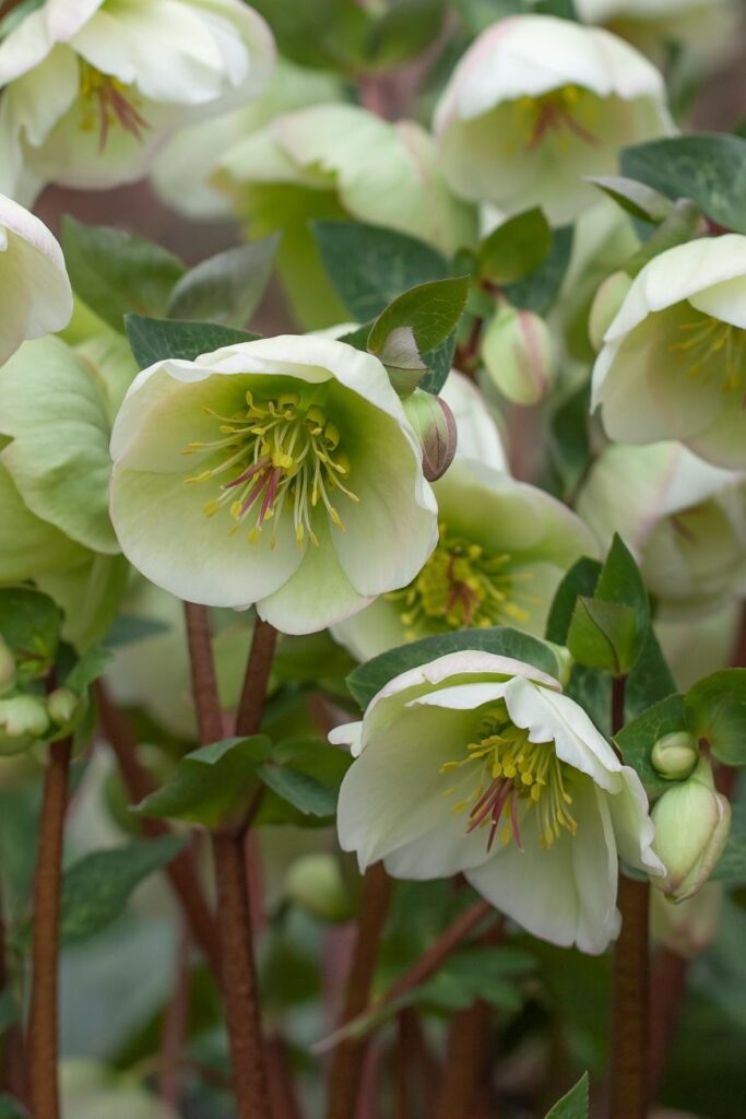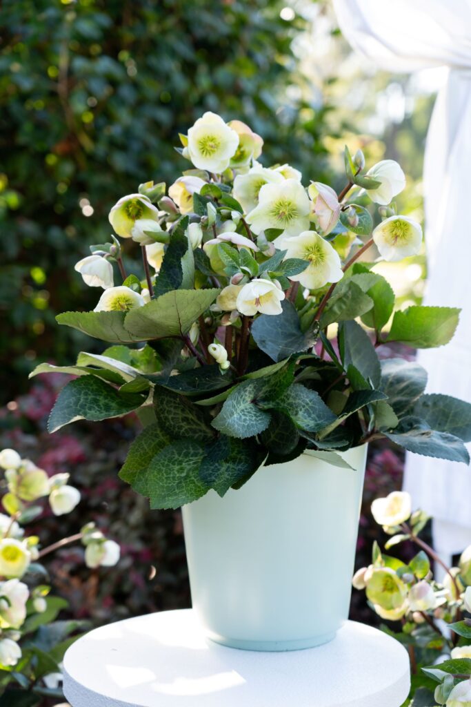 We regard Hellebore Moondance as one of the best white selections yet. The reason? Not only do you get the spectacular marbled foliage and robust clumping habit. You also get a significant flower display with the flowers held upright and more upward facing rather than pendulous. The result is a flower display you can enjoy either indoors, outside in the shade garden, or for picking a bunch of flowers to bring indoors.