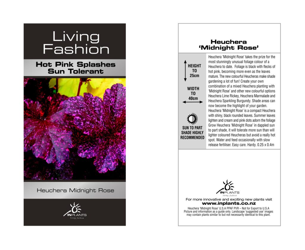 Shade areas can now become the highlight of your garden. This special plant was found by Terri Poindexter. Heuchera ‘Midnight Rose’ is a compact Heuchera with shiny, black rounded leaves. Summer leaves lighten and cream and pink dots adorn the foliage Grow Heuchera ‘Midnight Rose’ in dappled sun to part shade, it will tolerate more sun than will lighter coloured Heucheras but avoid a really hot spot. Water and feed occasionally with slow release fertiliser. Easy care. Hardy. 0.25 x 0.4m
