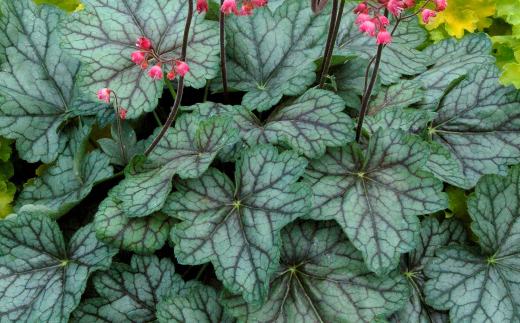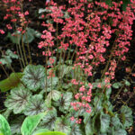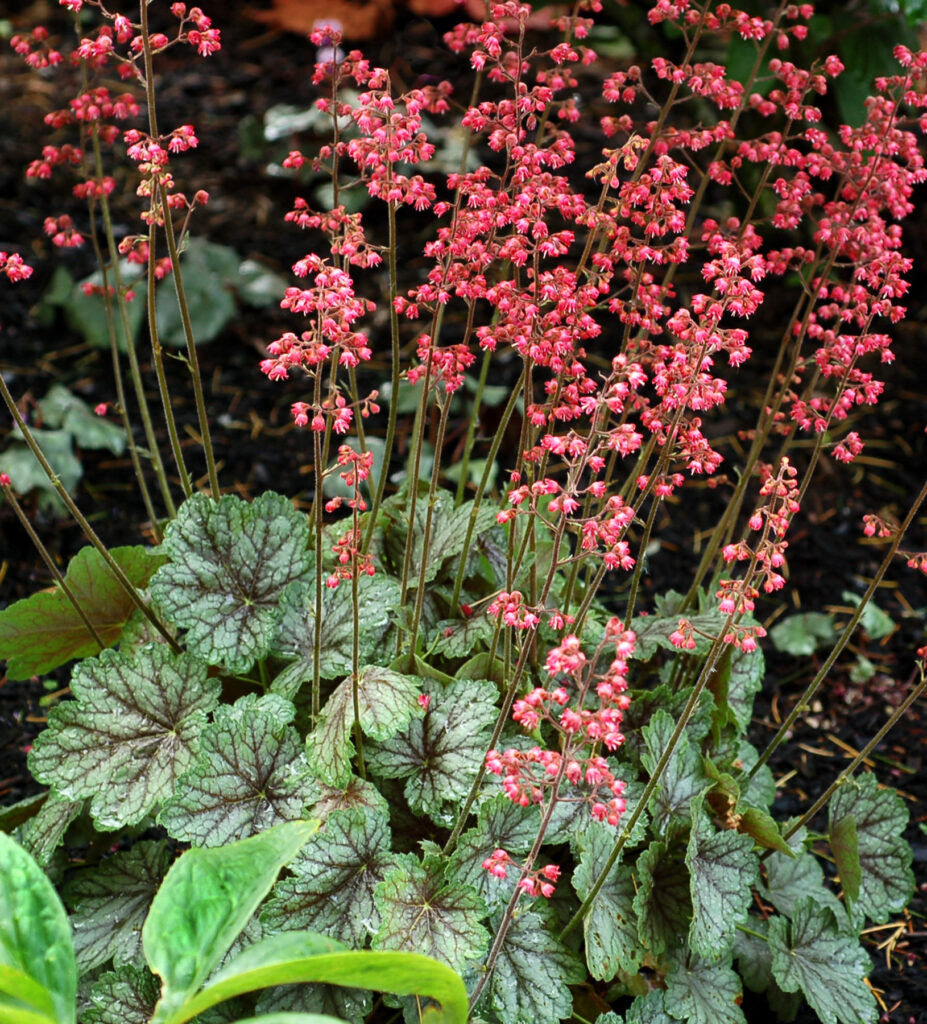 Heucheras are incredible garden plants for their toughness, colour and texture which looks good ‘all year round’. Some varieties are bred specifically for foliage while others for their lovely ‘coral bell’ flowers. Heuchera ‘Peppermint Spice’ is a combination of the best of both worlds, with ‘Green spice’ like foliage which is vibrant light green with dark red veining, and deepest pink flowers in profusion. This is a compact Heuchera and flower stems are mid length providing a nice display with flower stems remaining upright and attractive.