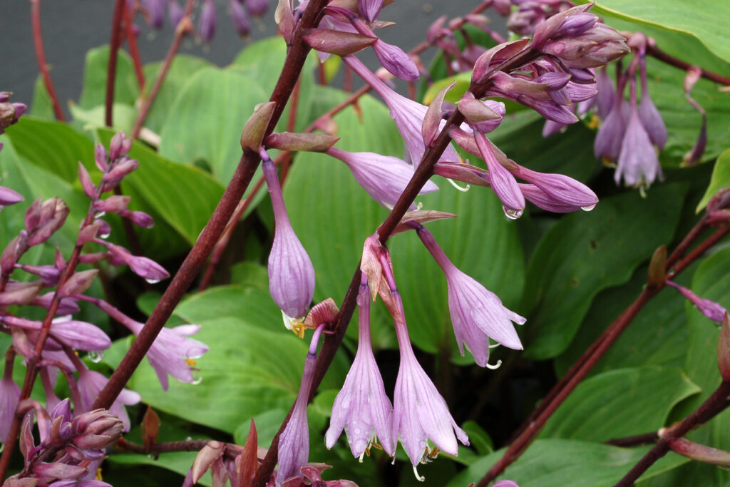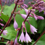 This hosta is quite unusual in its form. Leaves are a clear lime to mid green and a lovely contrast to the stems. Very compact with striking dark purple to black stems and slight veining, are topped by most unusual clear violet flower clusters held on upright flower spikes. This hosta will form dense clumps once established. As with all hostas these like a shaded position and form a nice foliage variant with Heucheras and Hellebores for a shade garden filled with texture and interest. Protect from snails and slugs, though this hosta does seem to be better at resisting molluscs than most!