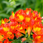 Vibrant orange flowers with a striking yellow throat are produced on mass covering a low mounding plant.