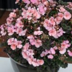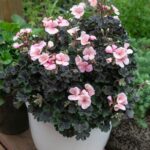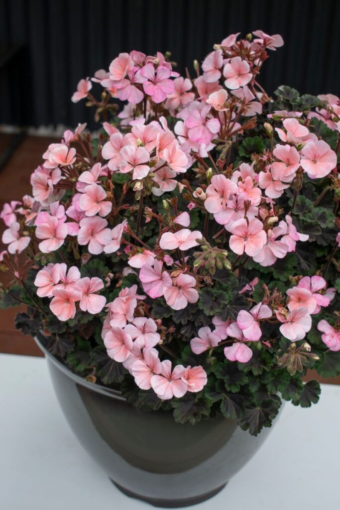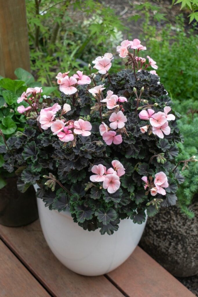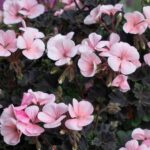 Lovely contrast of dark foliage and vibrant peach to pink flowers. As expected with pelargoniums this plant will love a sfull sun position and good drainage. Trim if desired but these plants should hold a nice shape in the pot, container or garden bed. Easy care.