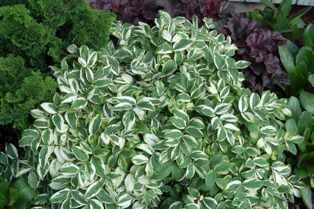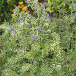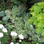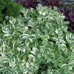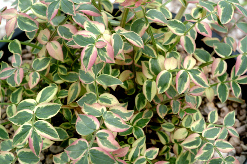 This striking variegated Jacob’s Ladder has cream and green variegated foliage giving an overall impression of a mound of delicate but boldly variegated leaflets. Unlike it’s predecessor, Polemonium. ‘Snow and Sapphires, ‘Stairway to Heaven has a bonus, in cool weather the variegation develops showy coral pink accents as shown. An eye-catching display either mass planted in a border or in a pot as a most unusual specimen. A bonus are the light blue flower spikes which emerge in late summer. Foliage clumps 30cm high x 25cm wide, with flower spikes up to 40cm. Keep the label – your friends will want to know about this plant! Group plant in sun to semi shade for best effect. Suitable pot or container plant but keep moist. Hardy perennial which may die back in winter in cooler areas. Do not allow to dry out in sunny conditions. Protect from intense afternoon sun. You can cut back, feed and water for a flush of beautiful new growth if desired