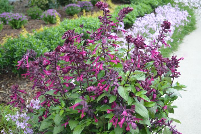 Salvia ‘Love and Wishes’ grows well in most soil types but thrives in fertile, well drained soils. Trim off around one third of size after flowering to maintain