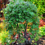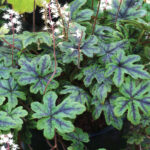Tiarella ‘Happy Trails’ features delightful white flowers on a vigorous low growing plant. Sports a profusion of runners and charming small rounded lobed leaves marked with a thick black band on the veins. Wonderful as a shaded groundcover, or in a mixed container or hanging basket. The lime green veined leaves hold their foliage colour throughout the year. Dark red stems are effective and contrast nicely for winter interest.